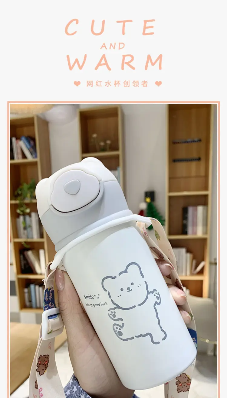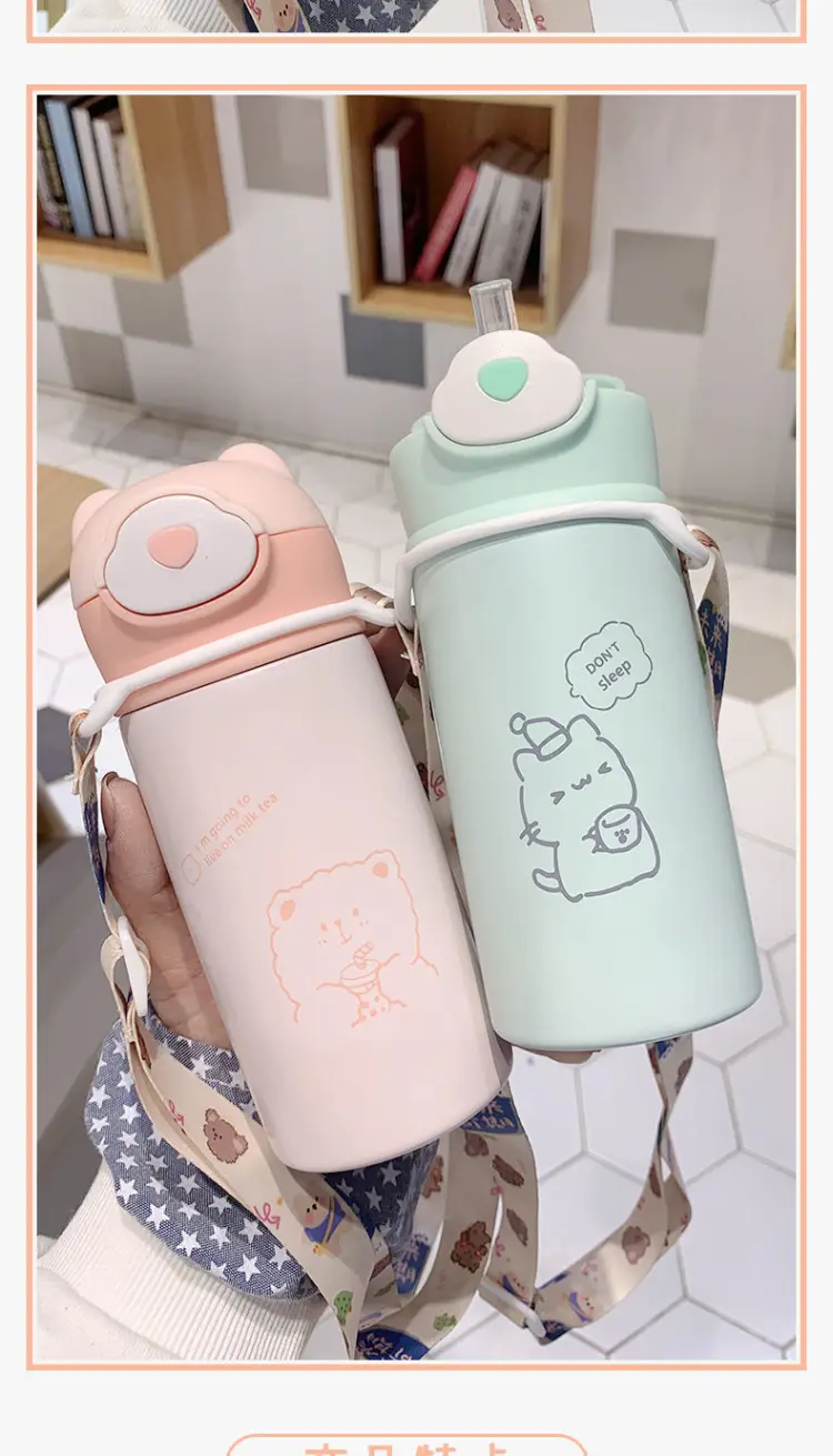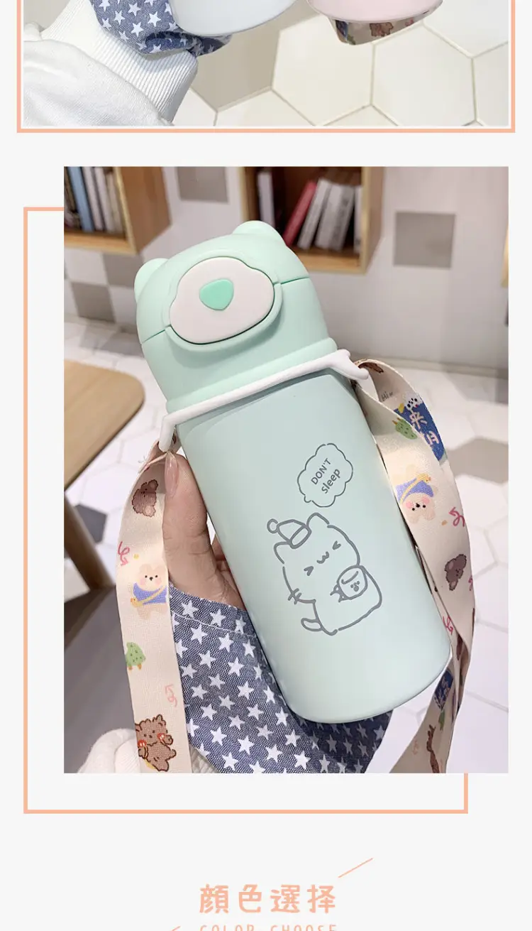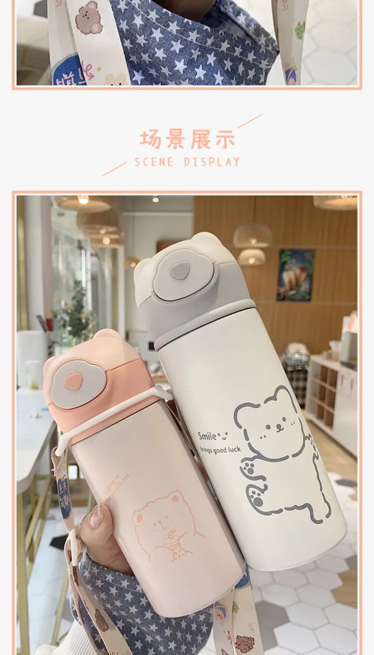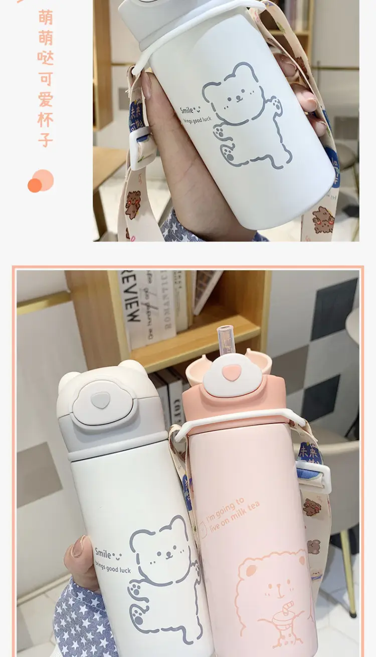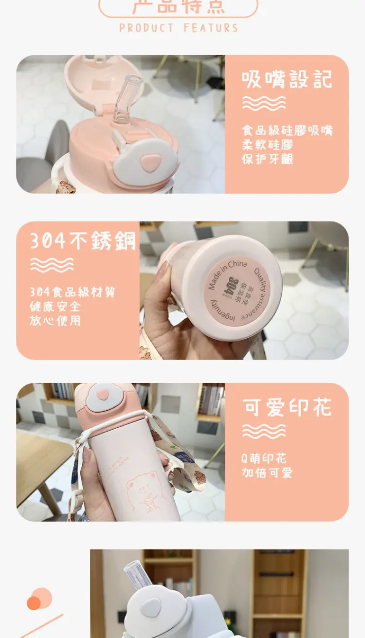 半小時前可爱卡通小熊儿童吸管保温杯学生便携背带304内胆创意弹跳盖水杯 - 特惠一入組