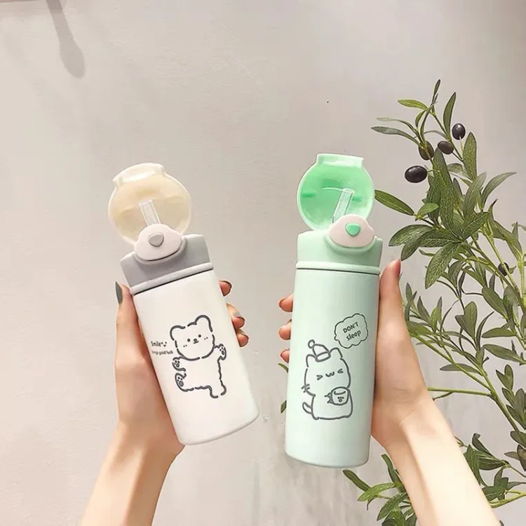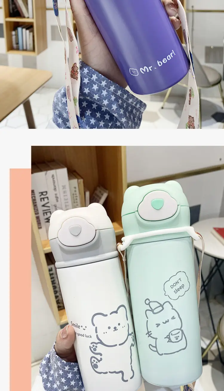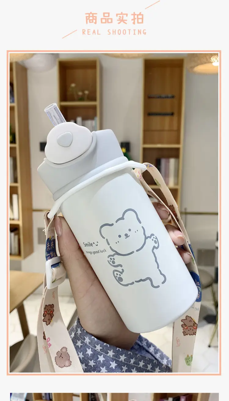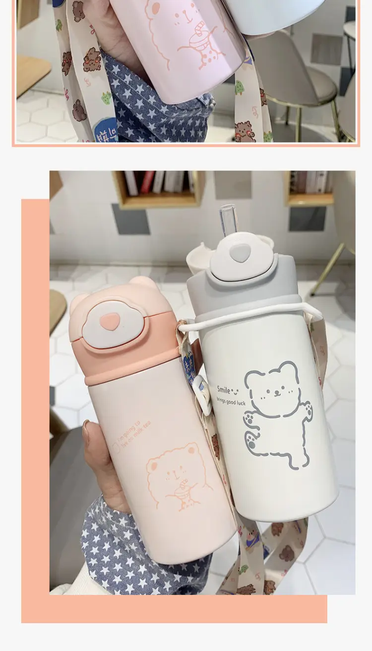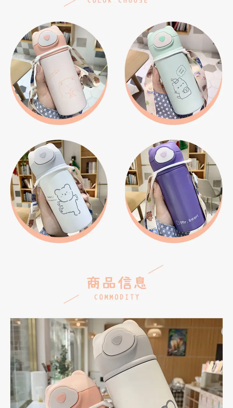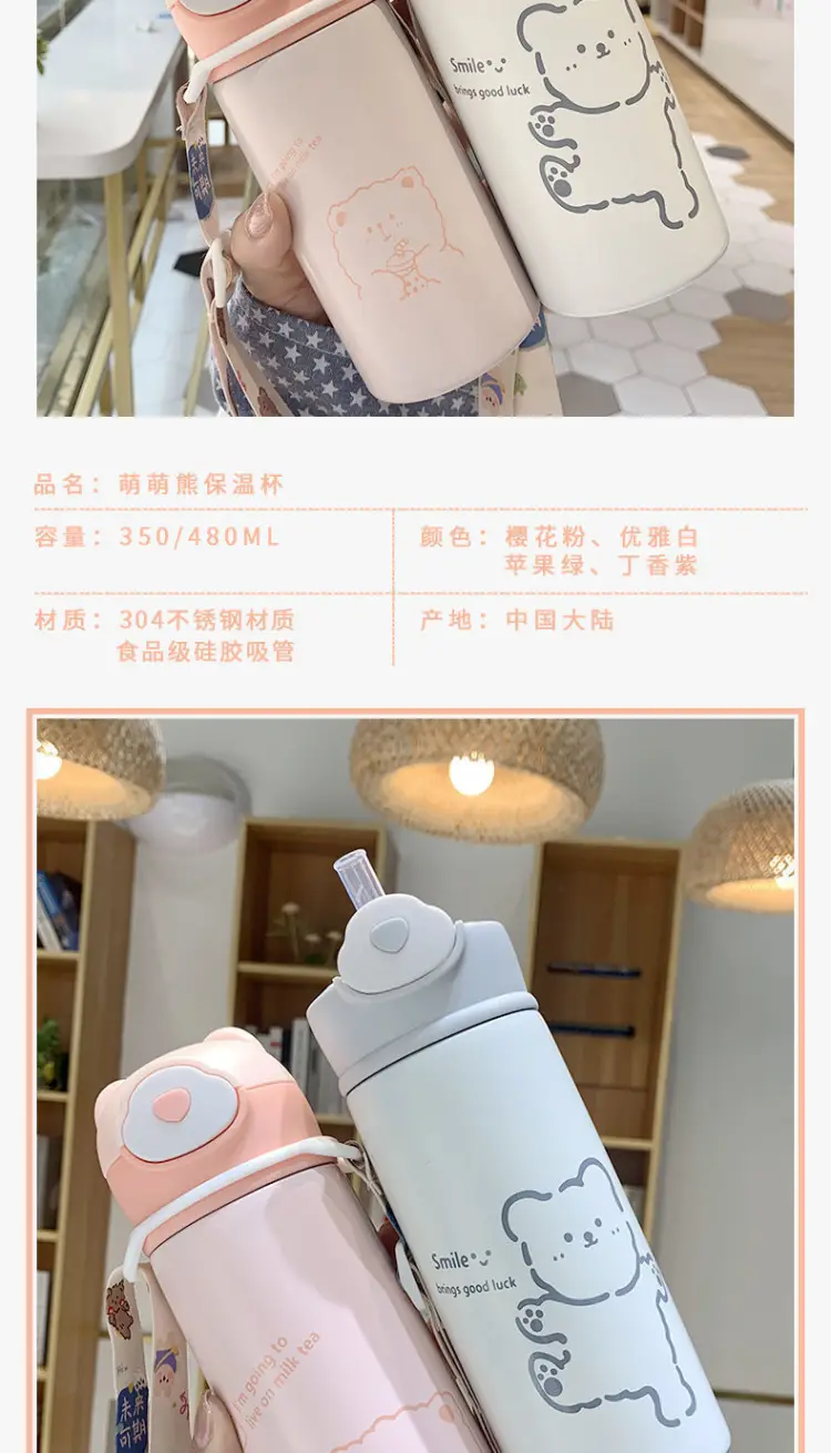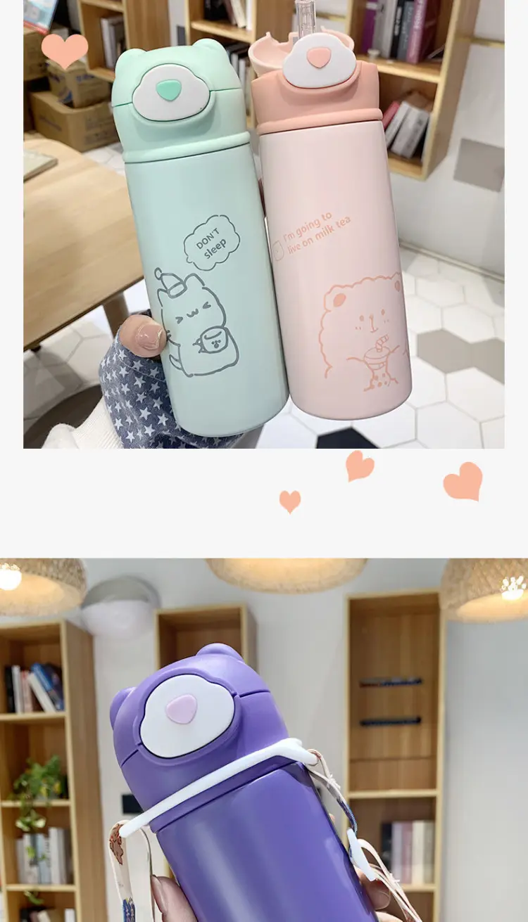 半小時前可爱卡通小熊儿童吸管保温杯学生便携背带304内胆创意弹跳盖水杯 - 特惠一入組